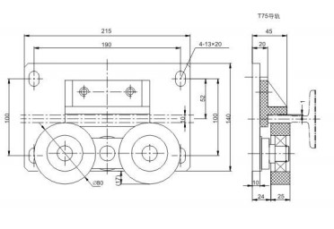 THY-GS-H29 villa elevator roller guide shoe is composed of a fixed frame, nylon block and roller bracket; nylon block is connected with the fixed frame by fasteners; the roller bracket is connected with the fixed frame through an eccentric shaft; the roller bracket is set up There are two rollers, the two rollers are separately arranged on both sides of the eccentric shaft, and the wheel surfaces of the two rollers are opposite to the nylon block. The roller guide shoe for villa elevator has adjustable distance between the roller and the nylon block, which is easy to install. The installation base hole distance is 190*100, the outer diameter of the roller is Φ80, and the PTFE material layer is adopted. Using its low friction factor and good wear resistance, the elevator runs smoothly to reduce the vibration problems in the elevator operation, and it is convenient Adjust, replace, extend its service life, improve ride comfort, reduce the noise generated by the operation of the car, suitable for backpack villa elevators, rated speed ≤ 0.63m/s, guide rail width 10mm, because the roller guide shoes can be used without lubricating oil. Ensure that the car and hoistway are clean and sanitary.